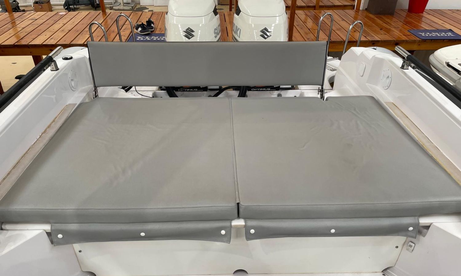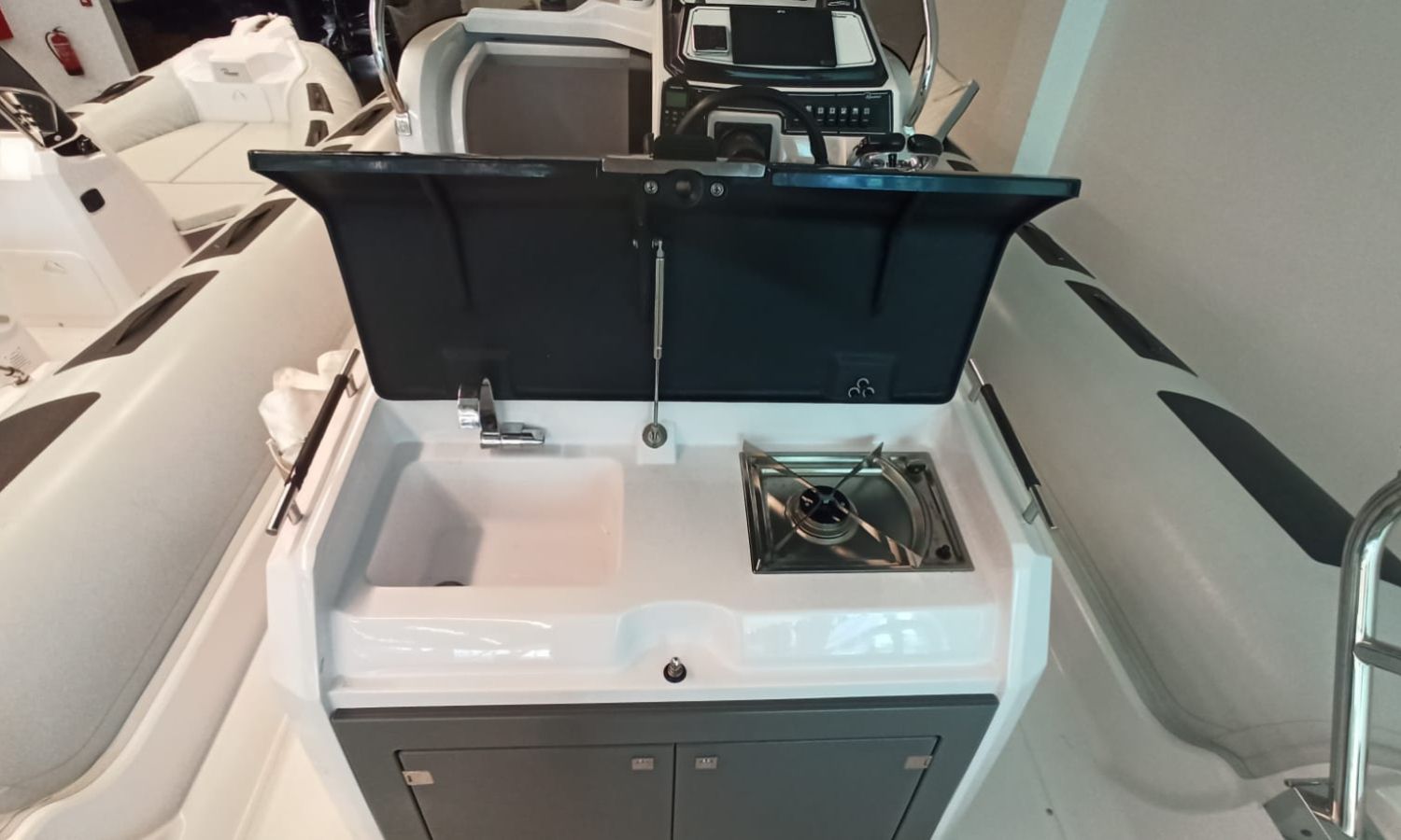 Bimini top – Cockpit covers – Bow sun cushions – Stern sun cushioins – Joystick – Bow thruster – VHF – GPS Plotter – Radar – Depthfinder – Electric anchor winch – SS anchor and chain – Anchor winch remote control with chain-counter – Electric battery switch – Electronic steering – WC with waste water tank – Electric refrigerator – Kitchen – Stern platforms with bathing ladder – Navigation lights – Anchoring light – Courtesy lights – SS roll-bar.