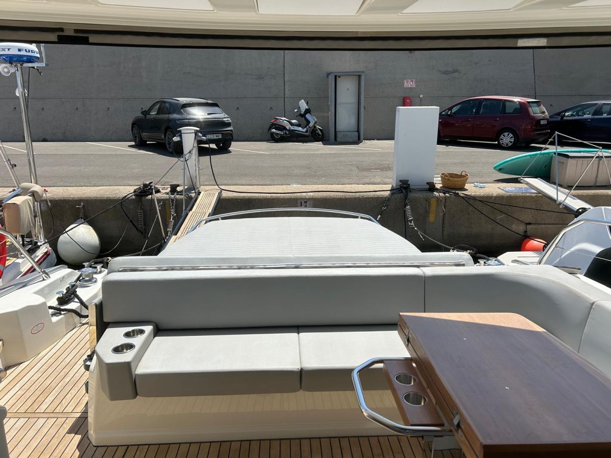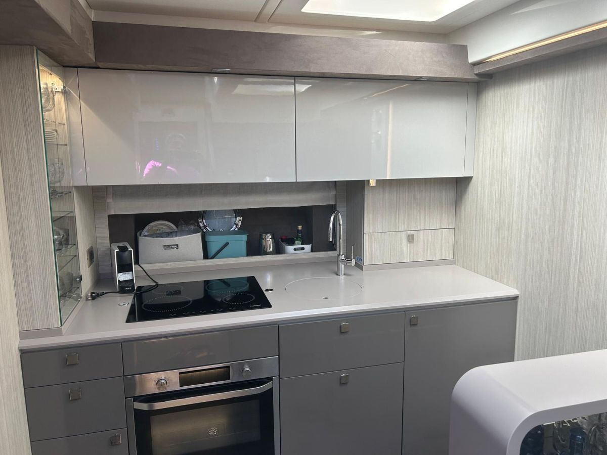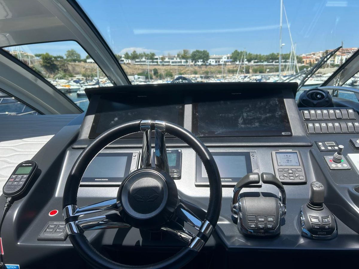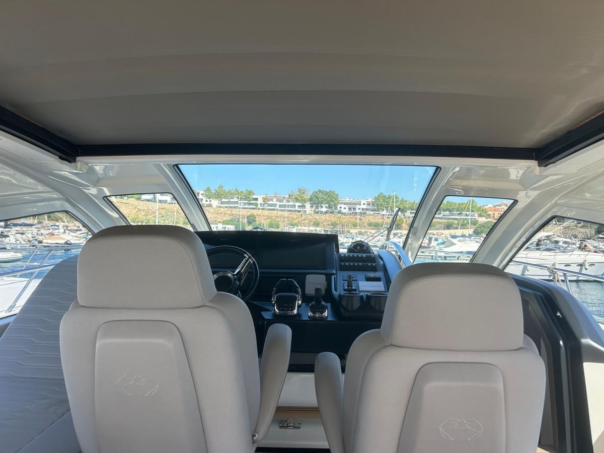 Hard top negro – Kit molinete para varada neumática auxiliar – Sistema de mandos Joystick – Dirección electrónica y mandos motores electrónicos – Aire acondicionado 48.000 BTU en camarotes y 24.000 BTU en bañera, con bomba de calor – Camarote de marinero con WC y lavabo – Capota cámper – Solárium de popa con funda – Cajafuerte electrónica – Correctores de planeada Automatic Trim Control – Hélice de proa – Faro pirata – Suplemento generador de 13 a 20 kW – Frigorífico en bañera 65 l – Barbacoa eléctrica en bañera – Máquina de hielo – Mesa bañera en teka – Luces de proa y luces subacuáticas – Pasarela hidráulica telescópica retráctil – Molinete eléctrico, cadena y ancla Ultramarine de inox – Radio Bluetooth/USB en salón – Radio Bluetooth/USB en cabina armador – Radio Bluetooth/USB en bañera y a proa – Estabilizador giroscópico Seakeeper 6 – Plataforma de popa hidráulica – Bañera, plataforma de popa y trancaniles en teka – Cortina eléctrica parasol de popa – TV LED 28″ en bañera con dispositivo eléctrico retráctil – 2 Molinetes de popa para amarre – Toma de puerto 220 V – Suelo interior de roble – Horno combinado con microondas – Lavavajillas – Encimera vitrocerámica con 4 fuegos – Tapicería exterior Silvertex color plata – Casco, plataforma, parte de la cubierta y garaje de color gris medusa – 2 GPS/Plotter – VHF – Ecosonda (temperatura y profundidad) – Piloto automático – 2 Camarotes dobles y 1 camarote individual – 2 Baños completos – Depósito de aguas negras – Calentador de agua 40 l – Cargador de baterías – Flaps de lamas Interceptor Humphree – Ducha de popa y de proa – Antifouling.