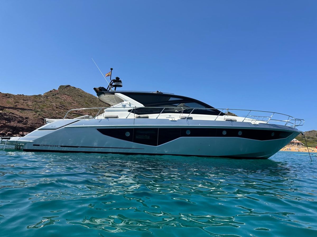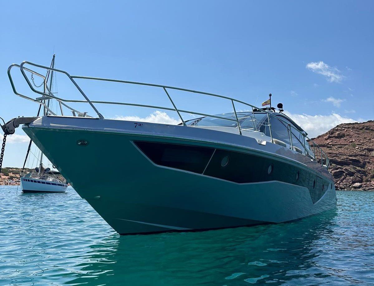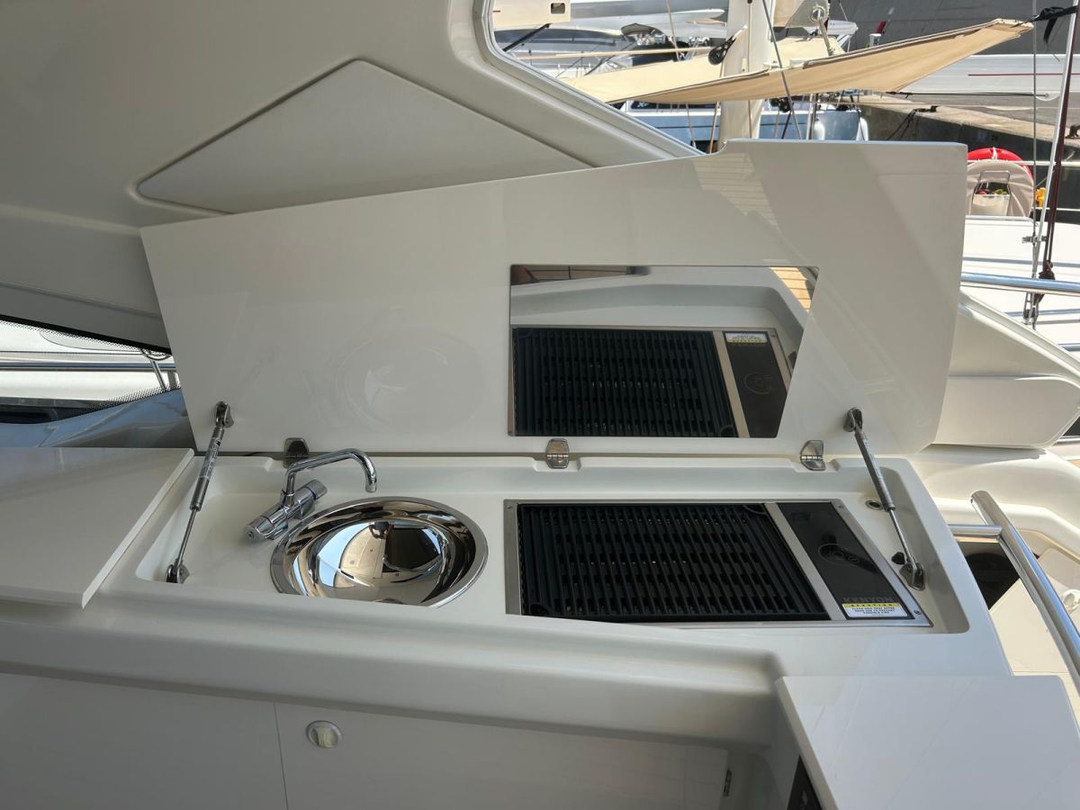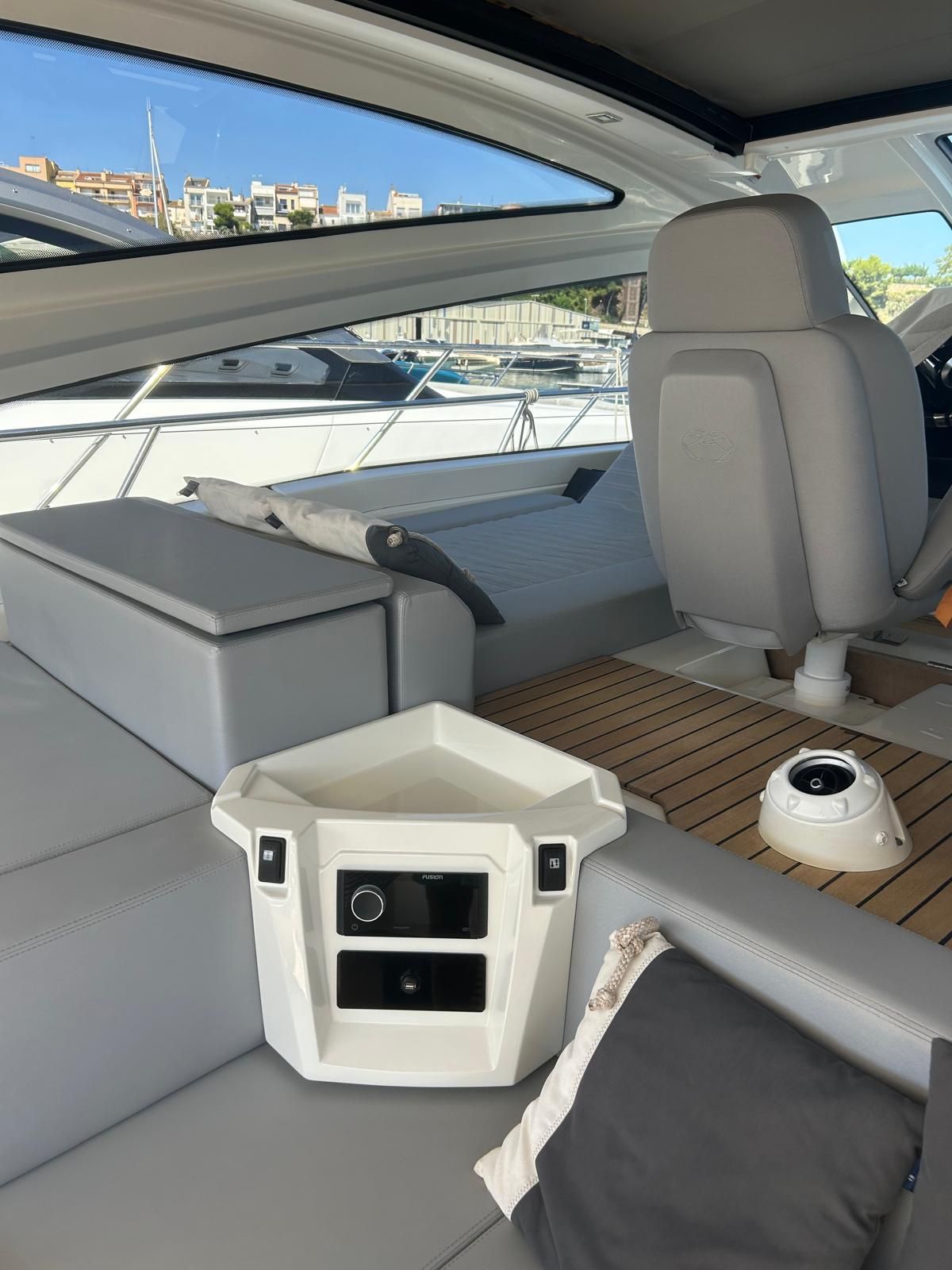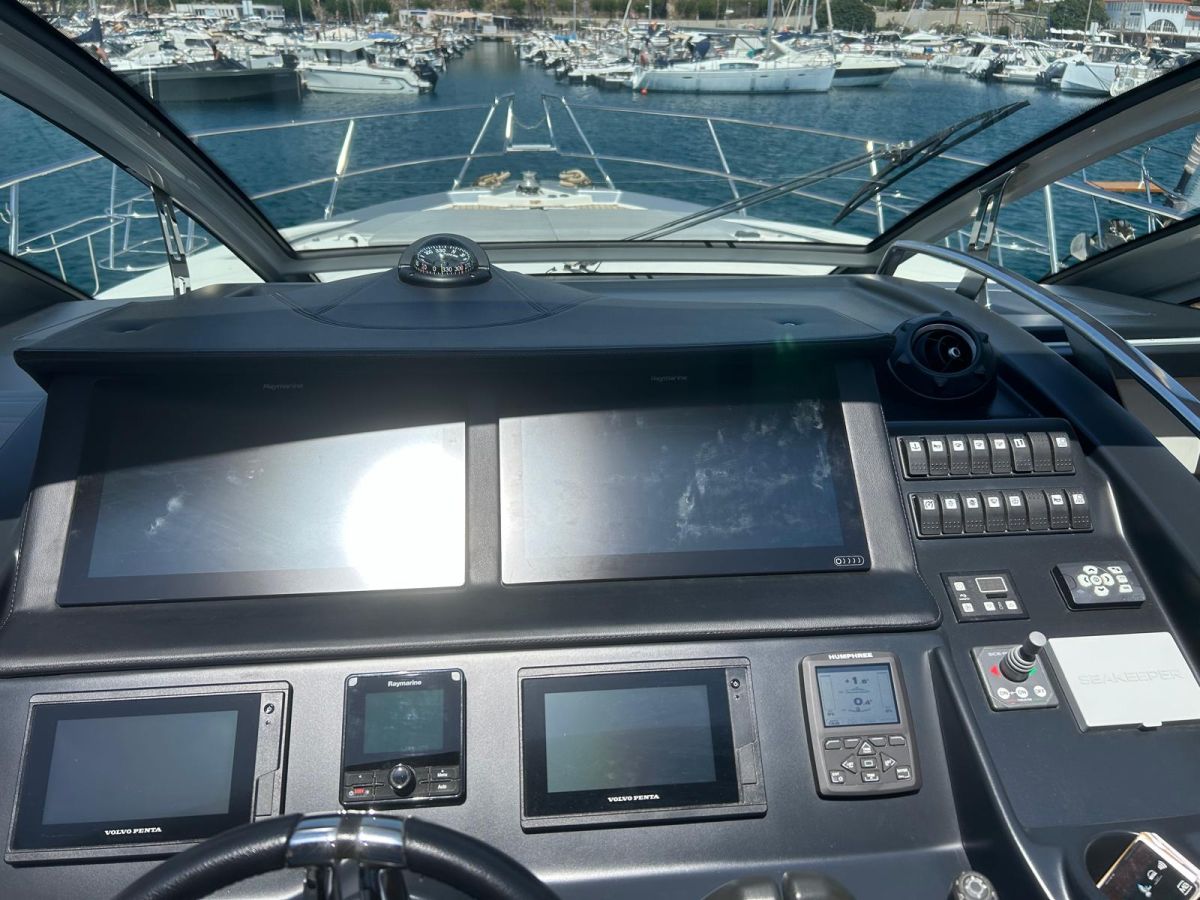 Hard top negro – Kit molinete para varada neumática auxiliar – Sistema de mandos Joystick – Dirección electrónica y mandos motores electrónicos – Aire acondicionado 48.000 BTU en camarotes y 24.000 BTU en bañera, con bomba de calor – Camarote de marinero con WC y lavabo – Capota cámper – Solárium de popa con funda – Cajafuerte electrónica – Correctores de planeada Automatic Trim Control – Hélice de proa – Faro pirata – Suplemento generador de 13 a 20 kW – Frigorífico en bañera 65 l – Barbacoa eléctrica en bañera – Máquina de hielo – Mesa bañera en teka – Luces de proa y luces subacuáticas – Pasarela hidráulica telescópica retráctil – Molinete eléctrico, cadena y ancla Ultramarine de inox – Radio Bluetooth/USB en salón – Radio Bluetooth/USB en cabina armador – Radio Bluetooth/USB en bañera y a proa – Estabilizador giroscópico Seakeeper 6 – Plataforma de popa hidráulica – Bañera, plataforma de popa y trancaniles en teka – Cortina eléctrica parasol de popa – TV LED 28″ en bañera con dispositivo eléctrico retráctil – 2 Molinetes de popa para amarre – Toma de puerto 220 V – Suelo interior de roble – Horno combinado con microondas – Lavavajillas – Encimera vitrocerámica con 4 fuegos – Tapicería exterior Silvertex color plata – Casco, plataforma, parte de la cubierta y garaje de color gris medusa – 2 GPS/Plotter – VHF – Ecosonda (temperatura y profundidad) – Piloto automático – 2 Camarotes dobles y 1 camarote individual – 2 Baños completos – Depósito de aguas negras – Calentador de agua 40 l – Cargador de baterías – Flaps de lamas Interceptor Humphree – Ducha de popa y de proa – Antifouling.