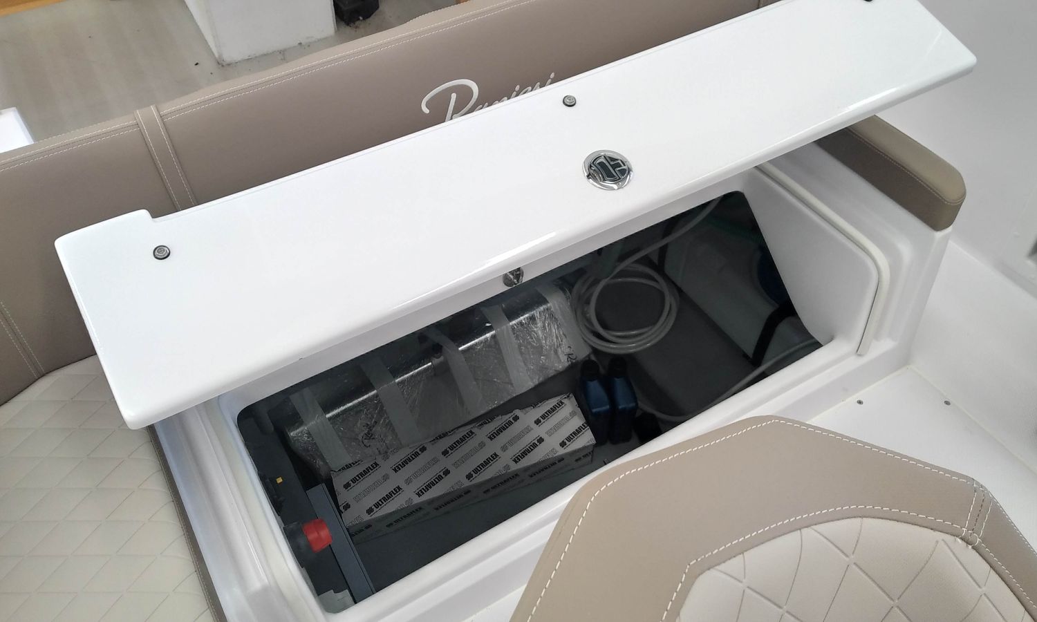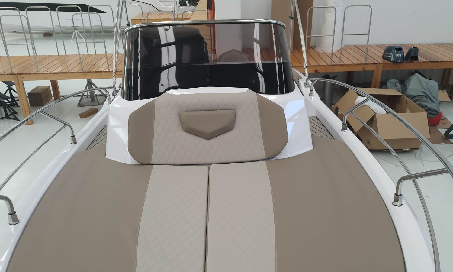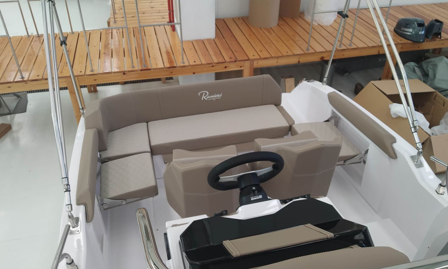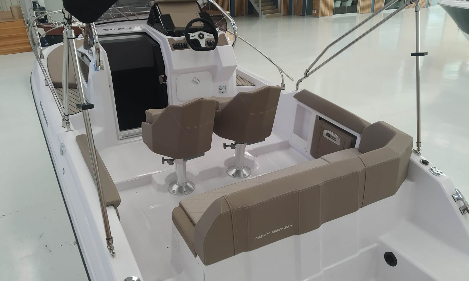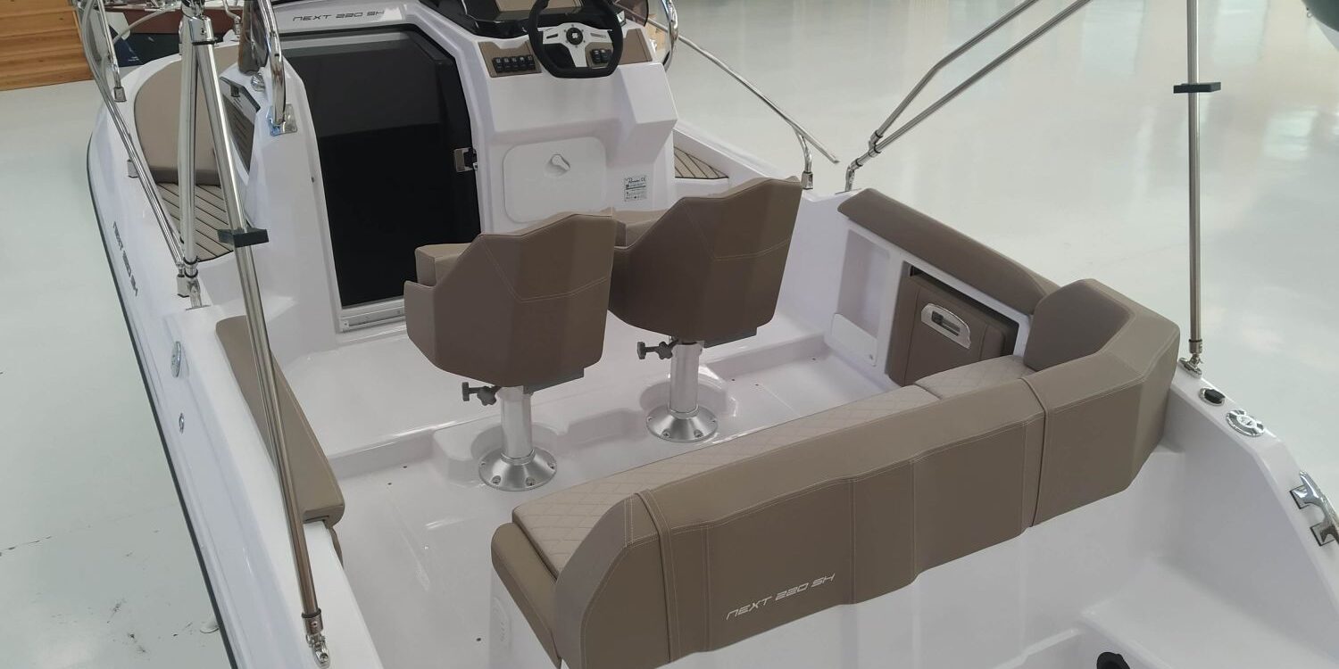 2 Sillones confort S-Line – Consola Luxury – Instalación ducha completa – Molinete eléctrico – Asientos laterales plegables – Tapicería Luxury – Mesa de popa en teka – Toldo parasol – Dirección hidráulica – WC eléctrico con depósito de aguas negras – Box WC separado – Transporte astillero a Costa Brava.