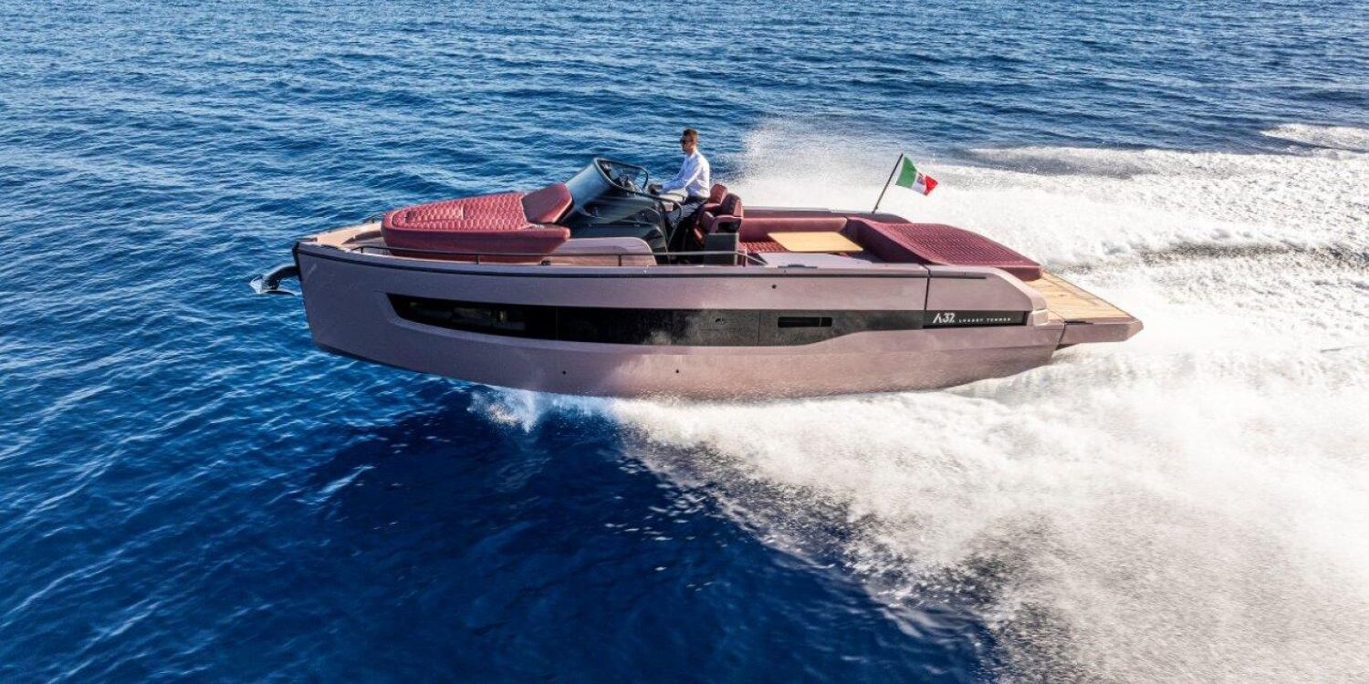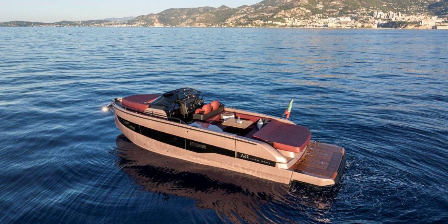 New boat available soon. Catalog photos, colors, and equipment may not correspond exactly to the unit offered. Model A 32 LT from the Italian shipyard Cranchi, with a total length of 10.21 meters. Modern design with straight bow, spacious layout, cabin, and sun deck at bow and stern.
