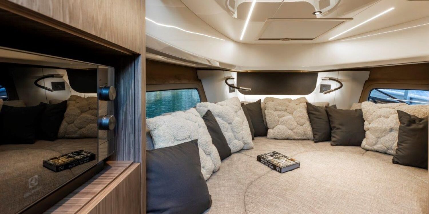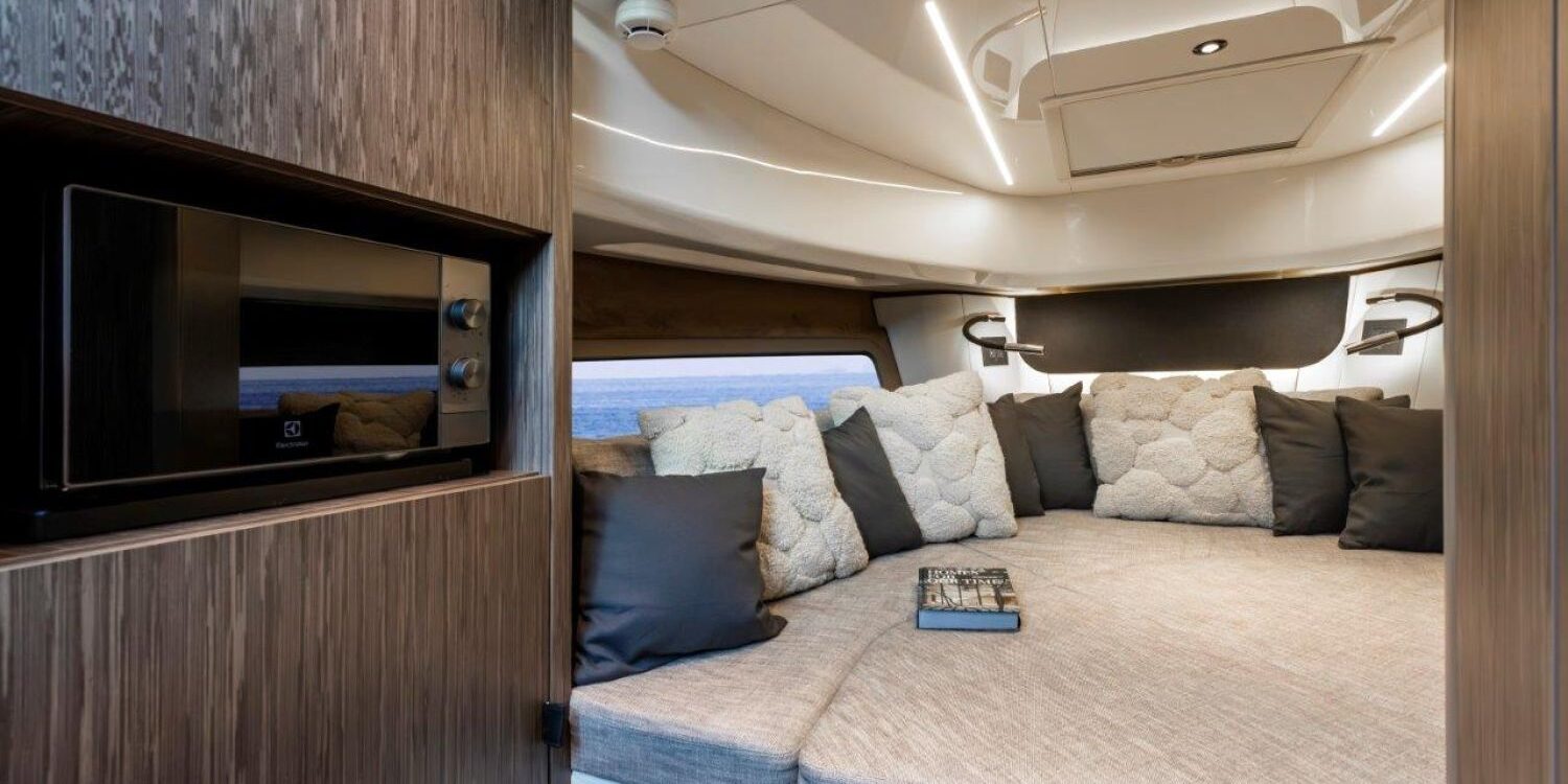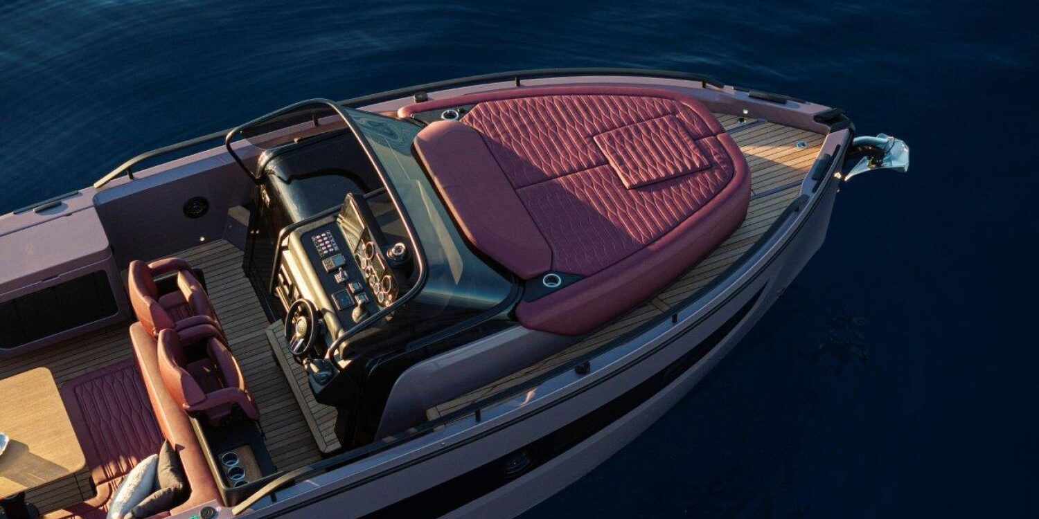 Joystick + Cruise control + Single lever control + Trip computer + Power trim assistance + Joystick docking – Black water tank – Black antifouling – Covers for dashboard and pilot and co-pilot seats – Bow mat with cover – Bow thruster – 90-liter cabin refrigerator – 35-liter cockpit refrigerator – 3 underwater lights – 6 fenders and covers – Teak surface on side steps – Teak stern platform – Teak at cockpit entrance and on folding side – Teak cockpit in steering area – Anchor cover – 800 W electric windlass, 50 m chain and 16 kg Ultramarine stainless steel anchor – Copy of CE certificate and declaration of conformity – Fender covers (alternative color to standard) – Dark Grey 11.11 wood interiors – Oak floorboards – Silvertex exterior upholstery (alternative color to standard) – Glossy protective coating for teak cockpit table – Preparation, launch, delivery, and sea trial – Transport from shipyard to Costa Brava.