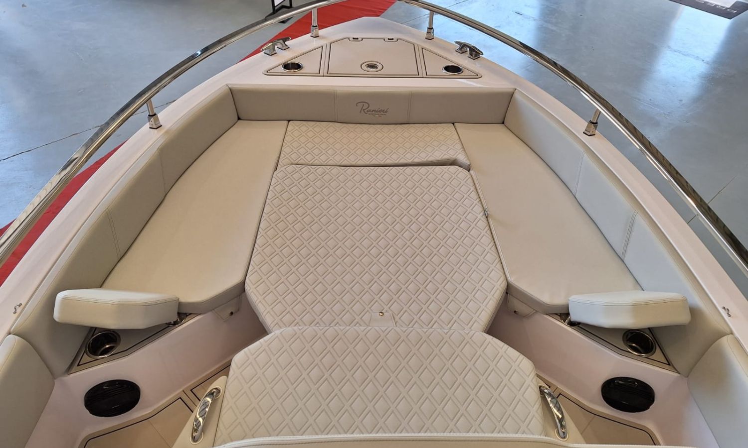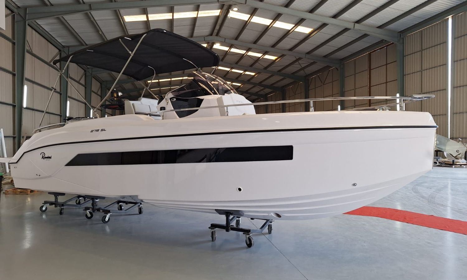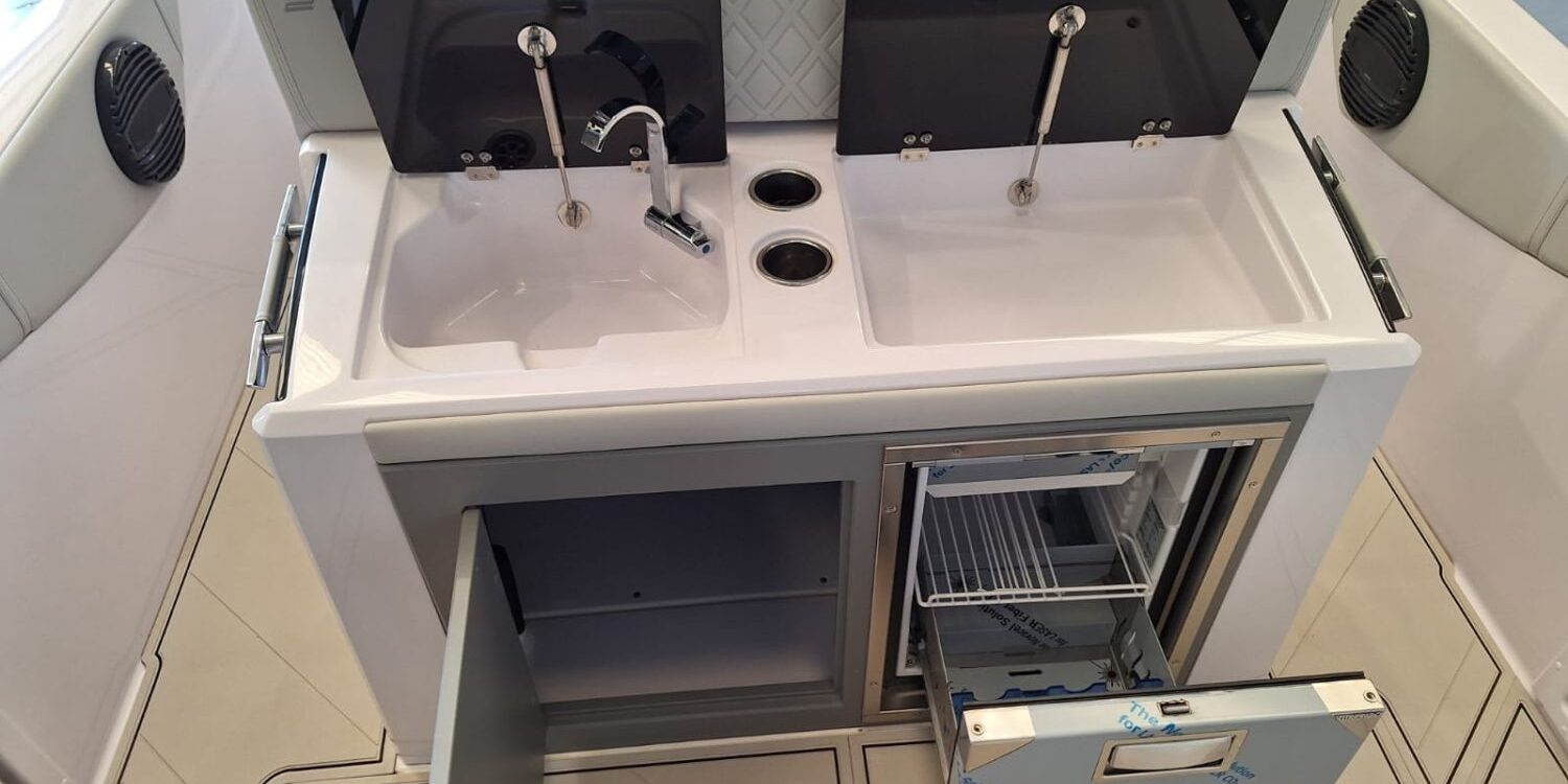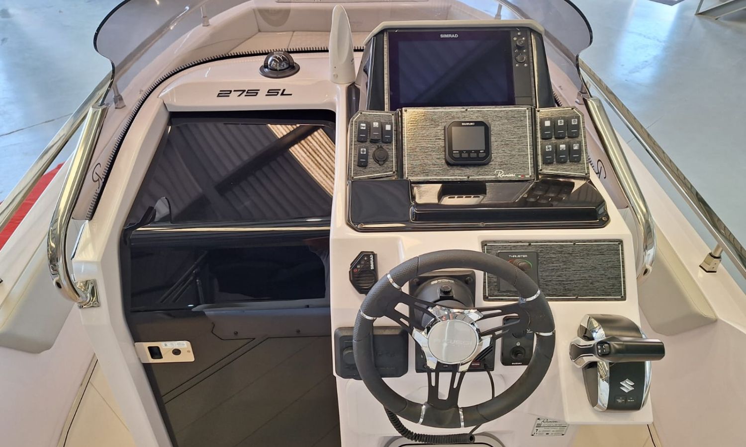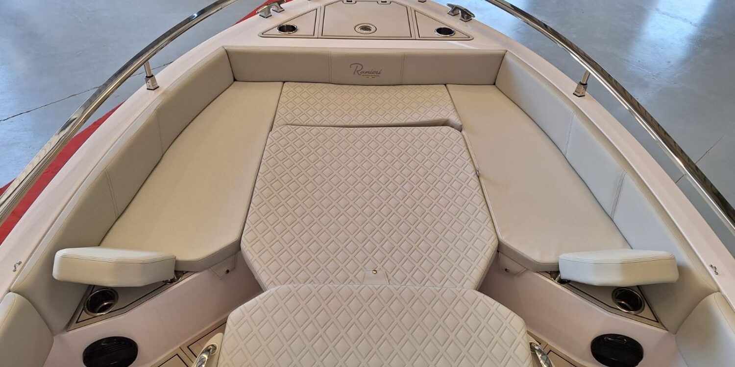 20-liter hot water heater – Bow thruster – Hertz stereo system with 6 speakers – 220 V shore power connection with battery charger – Foldable side seats – Luxury upholstery – Sun awning – Electronic package (12″ Simrad GPS, VHF, NMEA 2000 network, and nautical chart) – Suzuki pre-rigging – Preparation, engine installation, launch and delivery with sea trial – Transport from shipyard to Costa Brava.